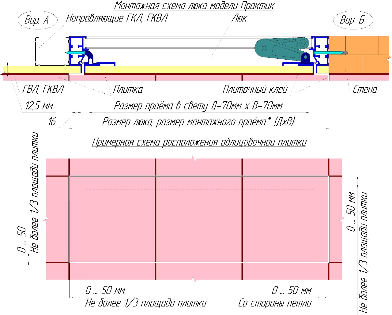 Люк под плитку премиум класса нажимной, настенный
