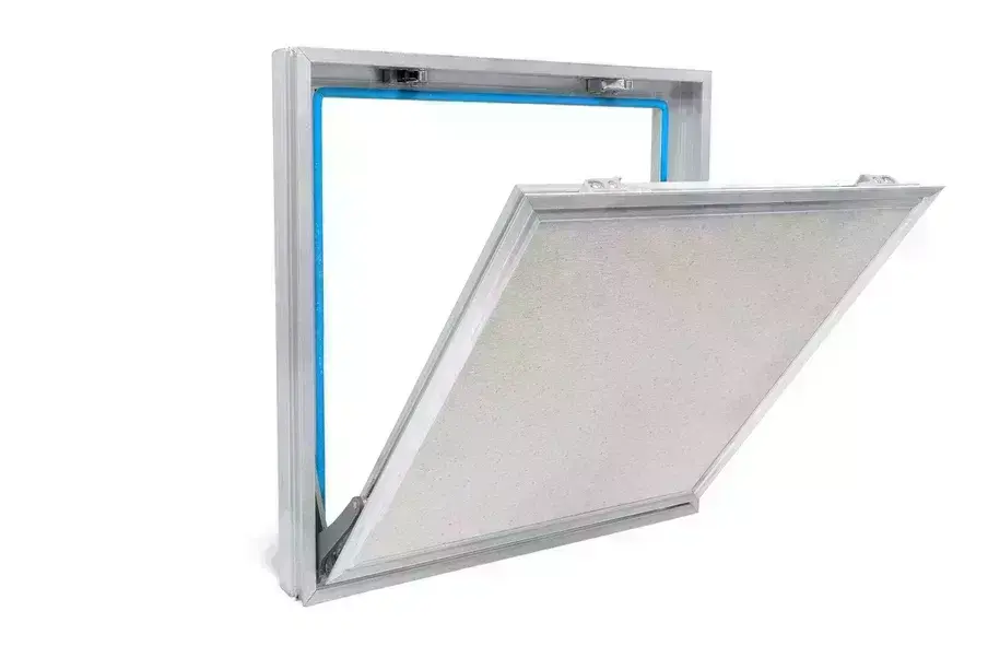 Рама люка для ревизии «Фурор» выполнена из алюминиевого профиля Г-образного в сечении для максимальной жесткости и удобства монтажа в уже подготовленный заранее проем. Дверца люка изготавливается из алюминиевого профиля Т-образной формы, переменного сечения, с выраженными ребрами жесткости, что делает её конструкцию более жесткой. Так как немаловажно исключить перекосы конструкции дверцы, чтобы не допустить деформации наклеенных на нее материалов. В отличие от наших конкурентов, толщина стенок алюминиевого профиля у нас по-прежнему 2 мм и более.
