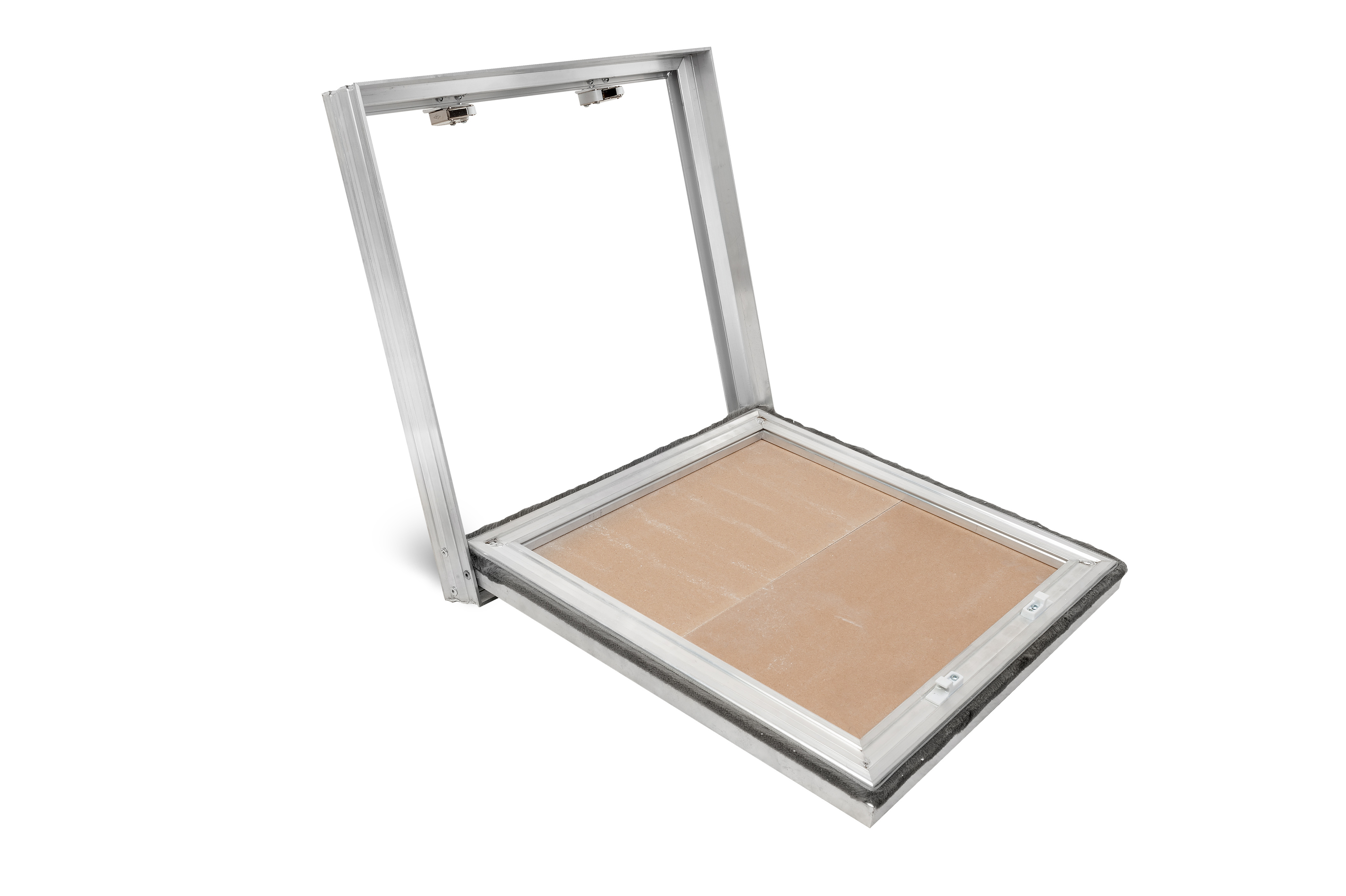 Алюминиевый профиль специальной формы, переменного сечения, делает данную конструкцию прочной и надежной в эксплуатации. Петлевые элементы состоят из специальных металлических закладных деталей из нержавеющей стали, которые позволяют изготавливать данные модели люков Больших размеров и исключают провисание дверцы в петле. Сам петлевой элемент из нержавеющей вытяжной заклепки. Щеточный уплотнитель, вклеенный в дверцу, в специальный хвостовик, защищает от пыли.