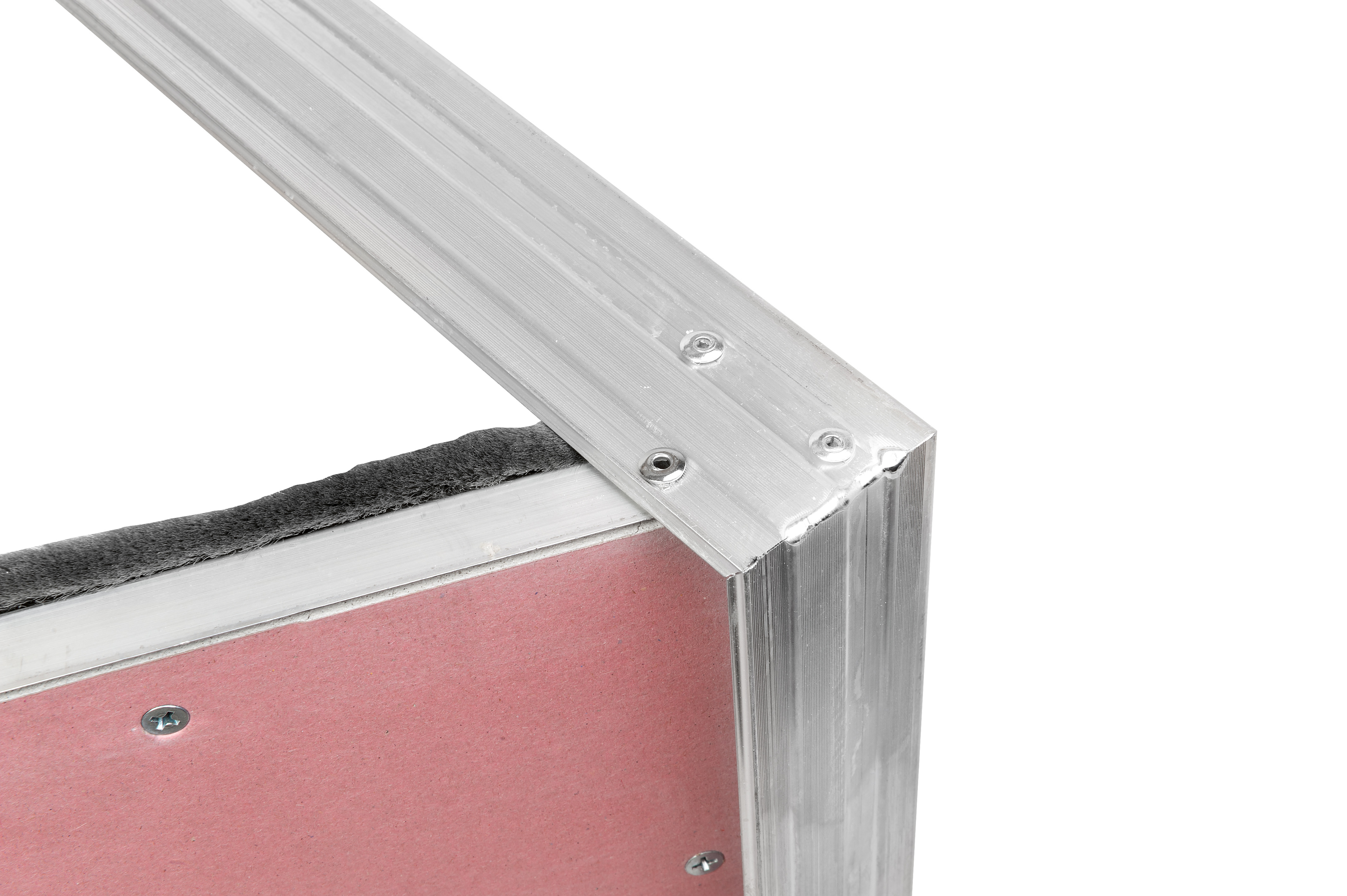 Увеличение жесткости дверцы достигается путем создания полости и разветвленного сечения алюминиевого профиля ее и сэндвичного наполнения дверцы люка ГКЛО/минвата/ГКЛВ(О), суммарной глубиной почти 43 мм. Щеточный уплотнитель, вклеенный в дверцу, защищает от пыли. Негорючий резиноподобный терморасширяющийся уплотнитель при попадании прямого огня на который - заполнит собой полость между дверцей и рамой, блокируя все зазоры, через которые может проникнуть пламя огня.
