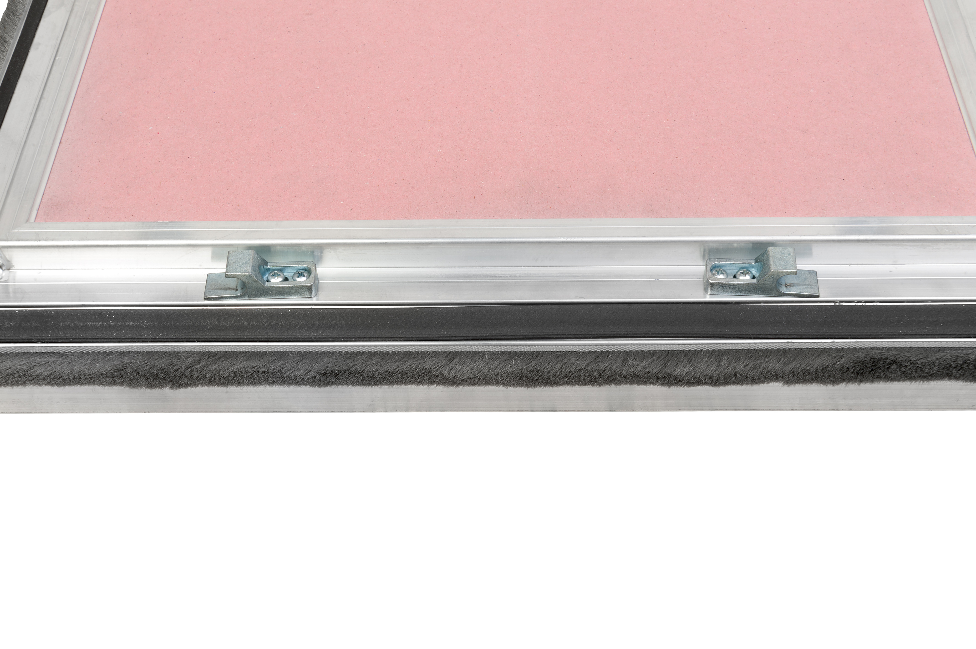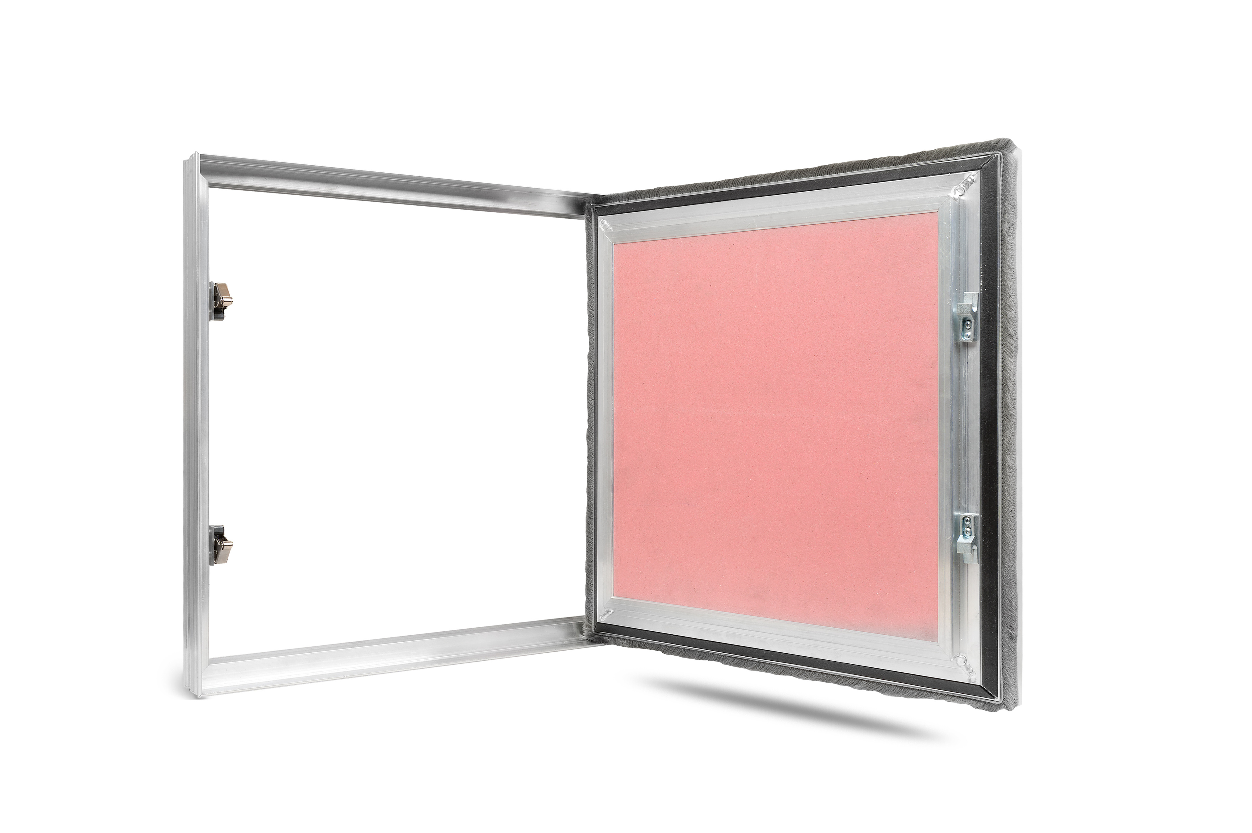 Увеличение жесткости дверцы достигается путем создания полости и разветвленного сечения алюминиевого профиля ее и сэндвичного наполнения дверцы люка ГКЛО/минвата/ГКЛВ(О), суммарной глубиной почти 43 мм. Щеточный уплотнитель, вклеенный в дверцу, защищает от пыли. Негорючий резиноподобный терморасширяющийся уплотнитель при попадании прямого огня на который - заполнит собой полость между дверцей и рамой, блокируя все зазоры, через которые может проникнуть пламя огня.